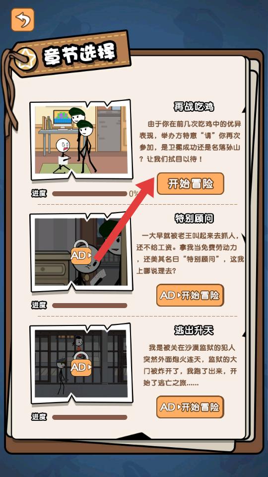 2、在章節選擇界面,有再戰吃雞,特別顧問,逃出升天等章節,部分章節可直接開始冒險,部分需看廣告。