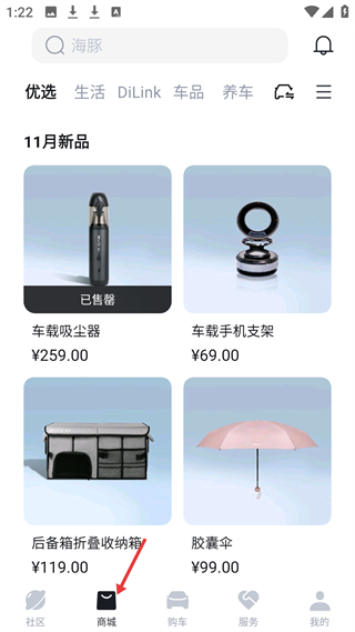 2、商城板塊涵蓋多分類,展示11月車載吸塵器等新品,滿足車主用車周邊購物需求。