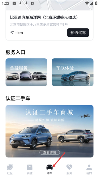 3、購車板塊可查4S店信息,有金融服務等入口及認證二手車商城,助力用戶購車和二手車交易。
