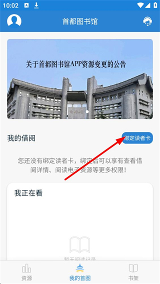 4、我的首圖界面,可看到關于首都圖書館APP資源變更的公告,點擊綁定讀者卡后可查看借閱詳情、閱讀電子資源等,還可查看正在閱讀的內容。