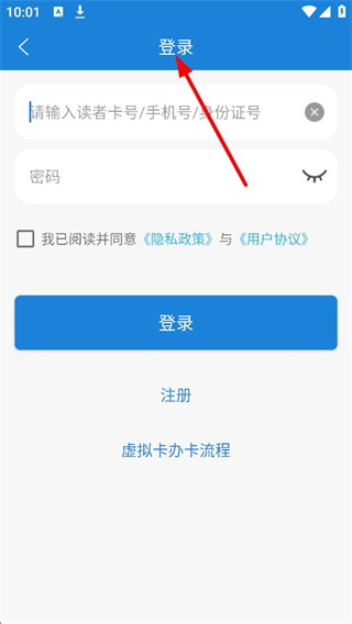 1、登錄界面,輸入讀者卡號、手機號、身份證號和密碼,勾選同意隱私政策與用戶協議后點擊登錄,也可選擇注冊或查看虛擬卡辦卡流程。