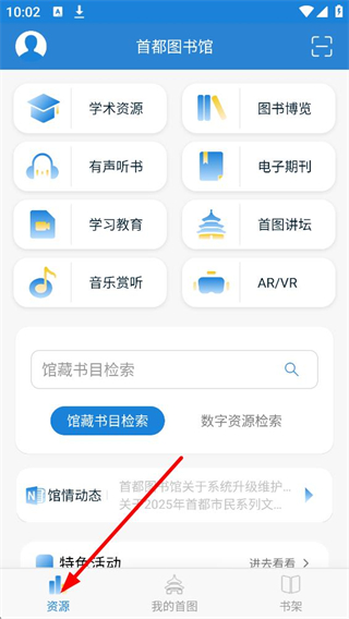 1、點首都圖書館APP資源頁,有學術資源、圖書博覽等多種資源入口,還有館藏書目檢索功能。