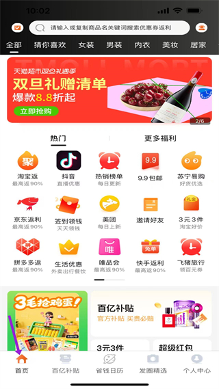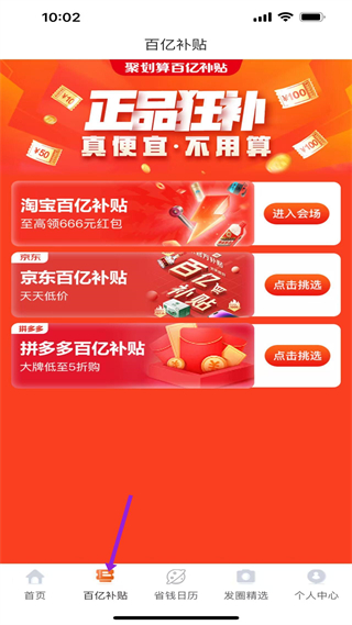 2、進入百億補貼頁面能看到淘寶京東拼多多的補貼入口,可點擊進入會場或點擊挑選,獲取對應的紅包與低價好物來參與。