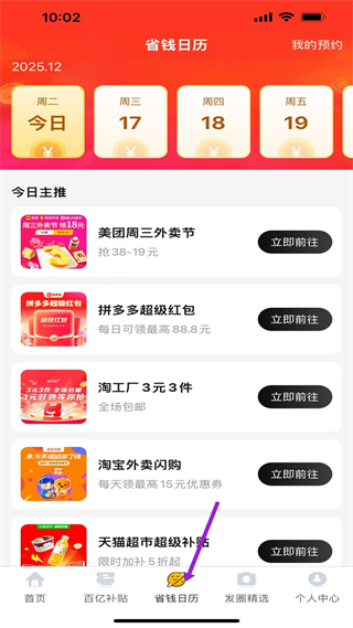 3、進入省錢日歷頁面能看到當日及后續日期的優惠,可點擊立即前往參與美團外賣節等活動,領取對應的優惠券來省錢。