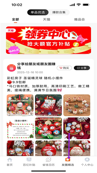 4、進入發圈精選頁面能看到領券中心和分享賺的商品,可點擊購買或分享,既能買到低價好物也能賺取相應的傭金。