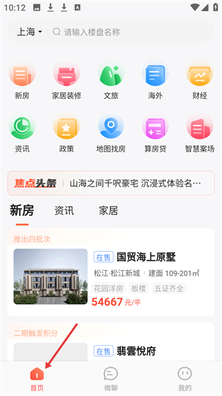 1、首頁有新房、家居裝修等入口,資訊政策板塊展示國貿海上原墅等新房,可查各類房產及相關資訊。