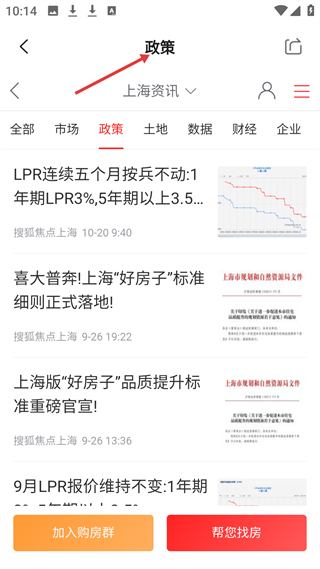 2、政策頁展示上海LPR、好房子標準等政策資訊,可了解上海樓市政策動態,還能加入購房群、找房服務。