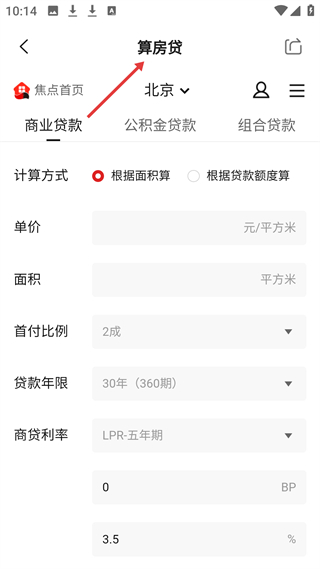 3、算房貸頁支持商業、公積金、組合貸款計算,可根據面積或貸款額度算房貸,幫助用戶規劃購房貸款。