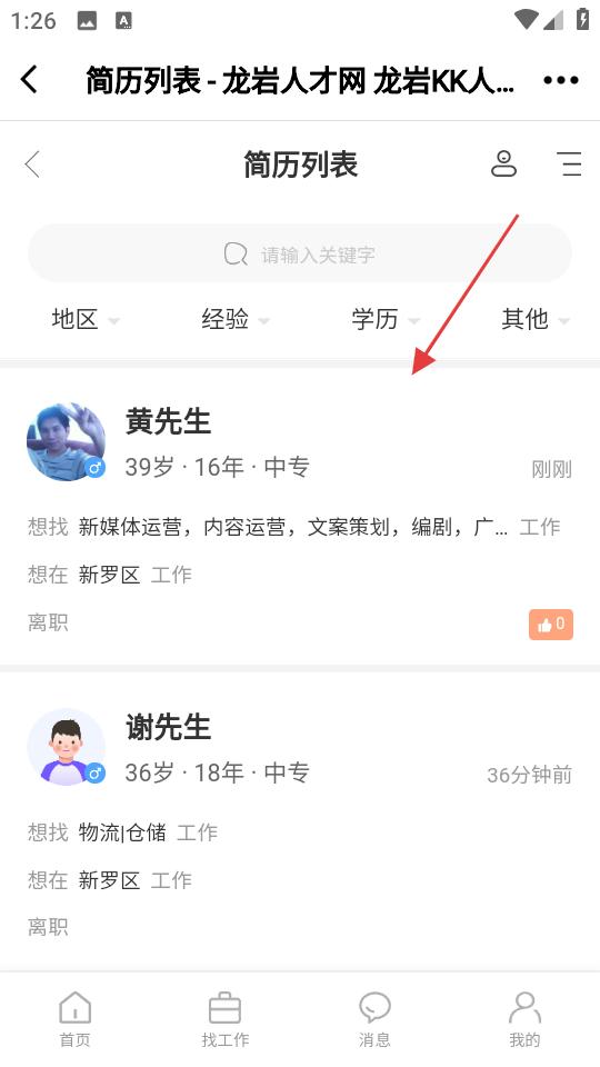 3、簡歷列表界面,展示了求職者的基本信息和求職意向,用戶可根據地區、經驗等條件篩選簡歷,方便企業快速找到合適的人才。