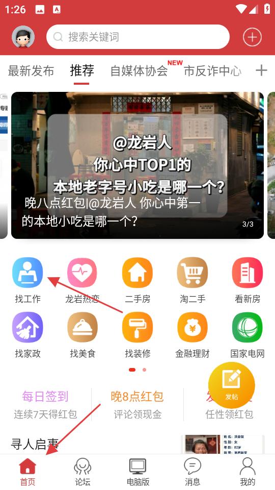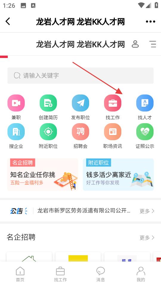 1、首頁界面,展示了多種服務入口,包括找工作、龍巖熱戀等,用戶可快速進入不同的服務板塊。