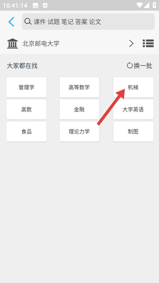 2、選定北京郵電大學后界面展示大家都在找的學科分類,點擊機械選項,可進一步查找該學科的課件試題筆記等資料,有效助力學科學習。