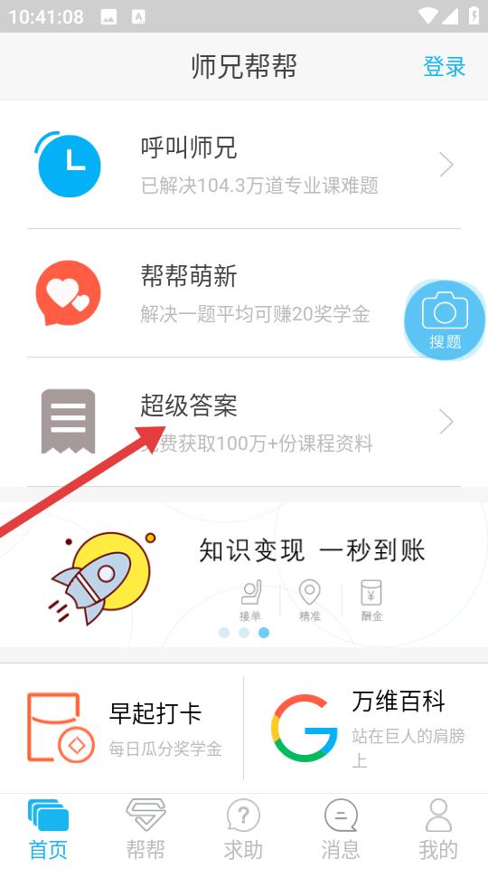 1、首頁可見呼叫師兄幫幫萌新等功能,其中超級答案模塊標注可免費獲取課程資料,為學生查找學習資料開辟便捷渠道。