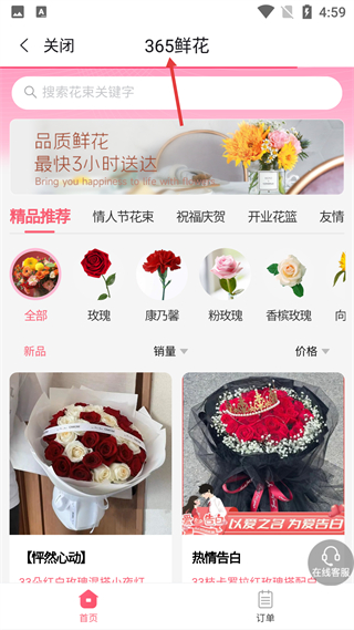 2、365鮮花板塊有搜索欄,推3小時達鮮花,設精品推薦等分類,展示怦然心動等花束,底部有首頁、訂單欄。