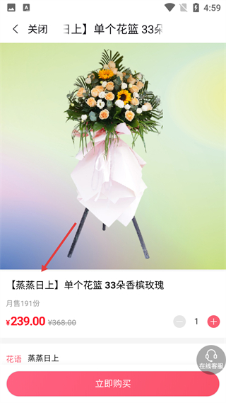 3、蒸蒸日上花籃商品頁,含33朵香檳玫瑰,月售191份,售價239元,花語蒸蒸日上,可立即購買,有在線客服。