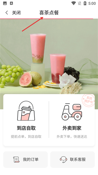 4、喜茶點餐板塊設到店自取、外賣到家方式,可提前點單或外賣下單,還有我的訂單、聯系客服入口。