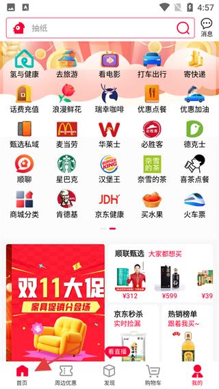 1、首頁有搜索欄,設氫與健康等入口,推雙11家具大促,展示順聯甄選等板塊,底部有首頁、周邊優惠等欄。