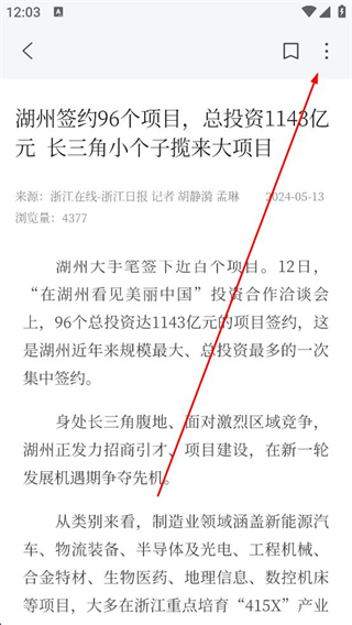 3、在資訊詳情頁面閱讀資訊的文字內容,了解項目簽約的規模投資等信息,點擊上方的三個點按鈕分享。