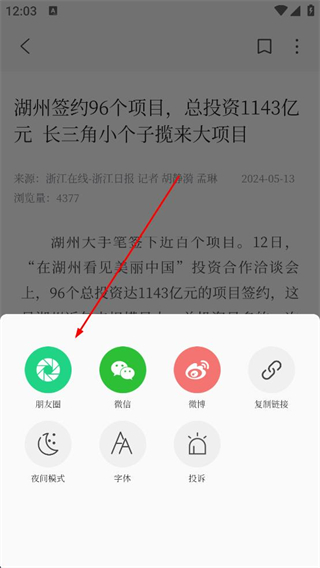4、在資訊詳情頁面點擊分享按鈕,選擇朋友圈微信等分享渠道,也能復制鏈接,還可調整夜間模式字體等設置,優化閱讀體驗。