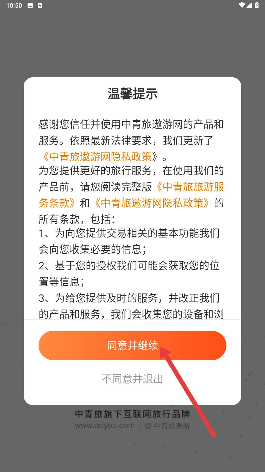 1、打開中青旅遨游旅行應用,彈出溫馨提示仔細閱讀內容,點擊同意并繼續,進入應用首頁。