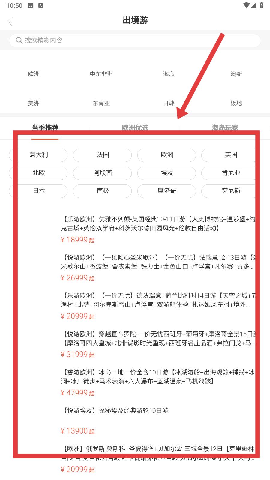 3、在出境游頁面,瀏覽歐洲、中東非洲等板塊的旅游產品,按需選擇目標旅游產品,點擊進入產品詳情頁面,查看行程、價格、服務等信息,進行預訂操作。
