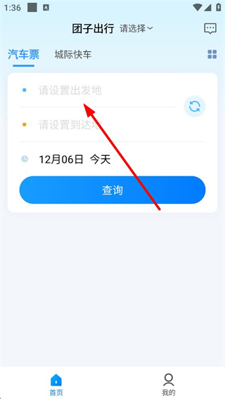 1、進入團子出行首頁的汽車票板塊,需先設置出發地與到達地,選定當日日期后,點擊查詢按鈕,即可獲取對應的車次相關信息。