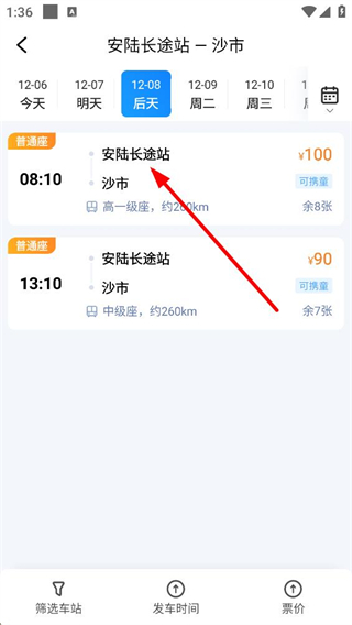 4、選擇對應線路進入車次詳情頁,可切換日期查看不同時段的車次,同時了解各車次的票價、座位類型以及當前的余票數量。