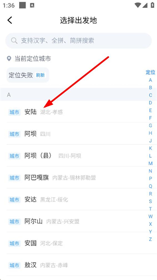 2、點擊設置出發地進入選擇頁面,這里支持多種搜索方式,也能從城市列表里選擇如安陸湖北孝感這類城市,確定出行的出發地。