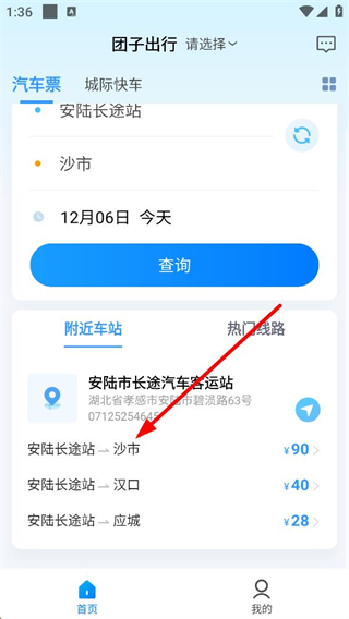 3、設置好出發地與到達地并完成查詢后,頁面會顯示附近車站及熱門線路,可看到安陸長途站到沙市等線路對應的票價信息。