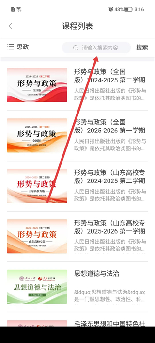 3、切換到思政分類的課程列表頁可查看形勢與政策等不同學期、不同版本的思政課程,了解課程信息。