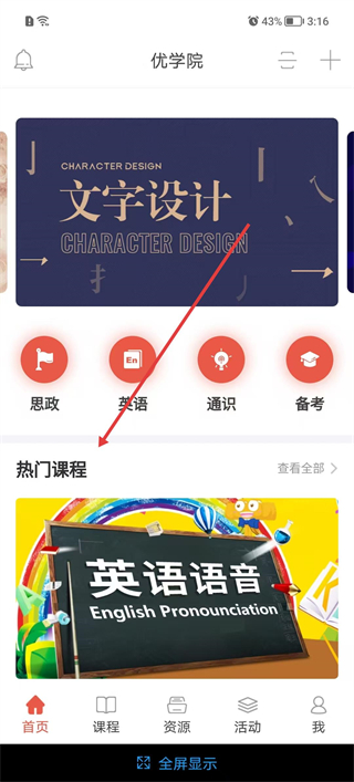 1、打開優學院app,可查看思政、英語等分類入口,點擊熱門課程板塊的英語語音,進入英語類課程列表頁。