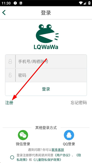 1、進入LQWawa登錄頁面,可輸入手機號、兩棲賬號與密碼登錄,也可選擇微信、QQ等第三方方式登錄,還能點擊注冊創建新賬號,需先同意相關協議。