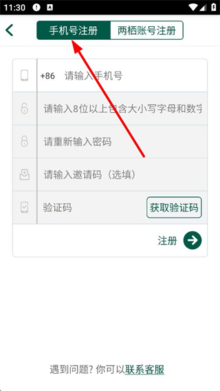 2、選擇手機號注冊,需填寫手機號、設置8位以上含大小寫字母和數字的密碼,重復輸入密碼,選填邀請碼后獲取并輸入驗證碼,點擊注冊完成賬號創建。