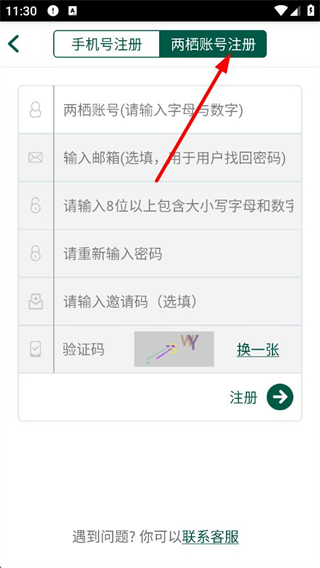3、切換到兩棲賬號注冊,需填寫字母數字組合的兩棲賬號,選填郵箱,設置符合要求的密碼并重復輸入,選填邀請碼后輸入圖片驗證碼,點擊注冊完成操作。