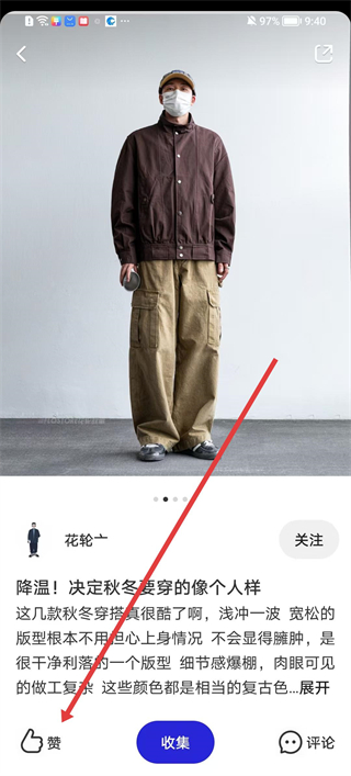 2、在穿搭詳情頁可點擊贊按鈕表達對該穿搭的喜愛,也能點擊收集按鈕將其保存至自己的收藏夾,方便后續查看,還可點擊評論按鈕與發布者互動交流。