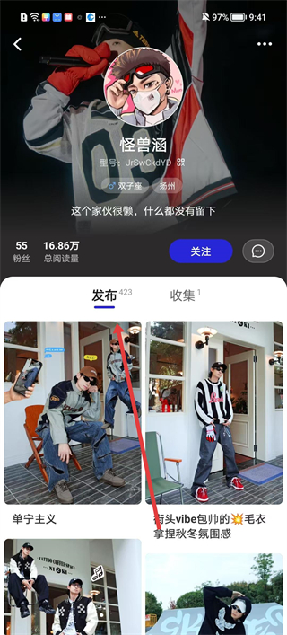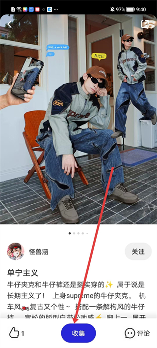 4、看到喜歡的穿搭帖子,除了點贊、收集外還可關注發布者怪獸涵等,以便及時獲取其新的穿搭發布內容,持續關注喜歡的穿搭風格動態。