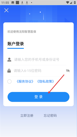 1、進入賬戶登錄頁面,輸入手機號碼或身份證號,填寫密碼,勾選服務協議與隱私政策,點擊登錄按鈕完成賬號登錄。