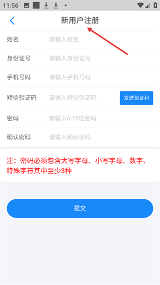 2、新用戶注冊頁,需填姓名、身份證號、手機號,輸驗證碼,設含至少3種字符的密碼后提交。