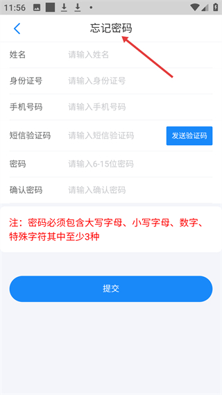 3、忘記密碼頁,需輸姓名、身份證號、手機號,輸驗證碼,設符合要求的新密碼后提交。