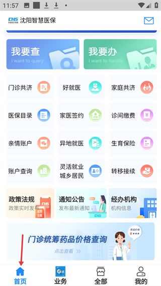 4、首頁,有我要查、我要辦板塊,涵蓋門診共濟、醫保目錄等醫保服務,還有政策法規、通知公告及藥品價格查詢功能。