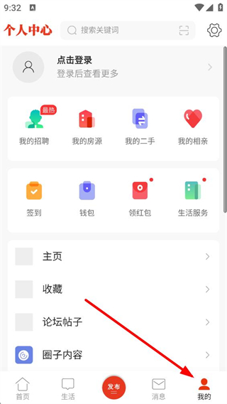2、點擊我的進入個人中心,可看到點擊登錄提示,登錄后可查看我的招聘、房源、二手、相親等信息,還能進行簽到、管理錢包、領紅包、使用生活服務等操作。