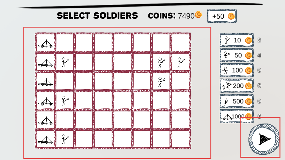 1、用金幣選擇不同兵種的火柴人,將它們布置在方格陣中搭配好陣容后,點擊開始按鈕,讓軍隊進入戰場。