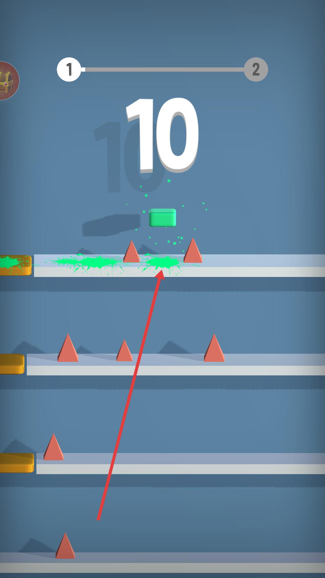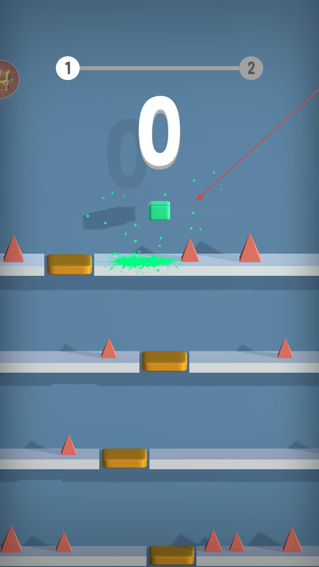 4、不斷操控磚塊在不同的平臺間移動,躲避尖刺,積累分數,推進游戲進程,嘗試在更多的關卡中成功讓磚塊避開尖刺,完成游戲挑戰。