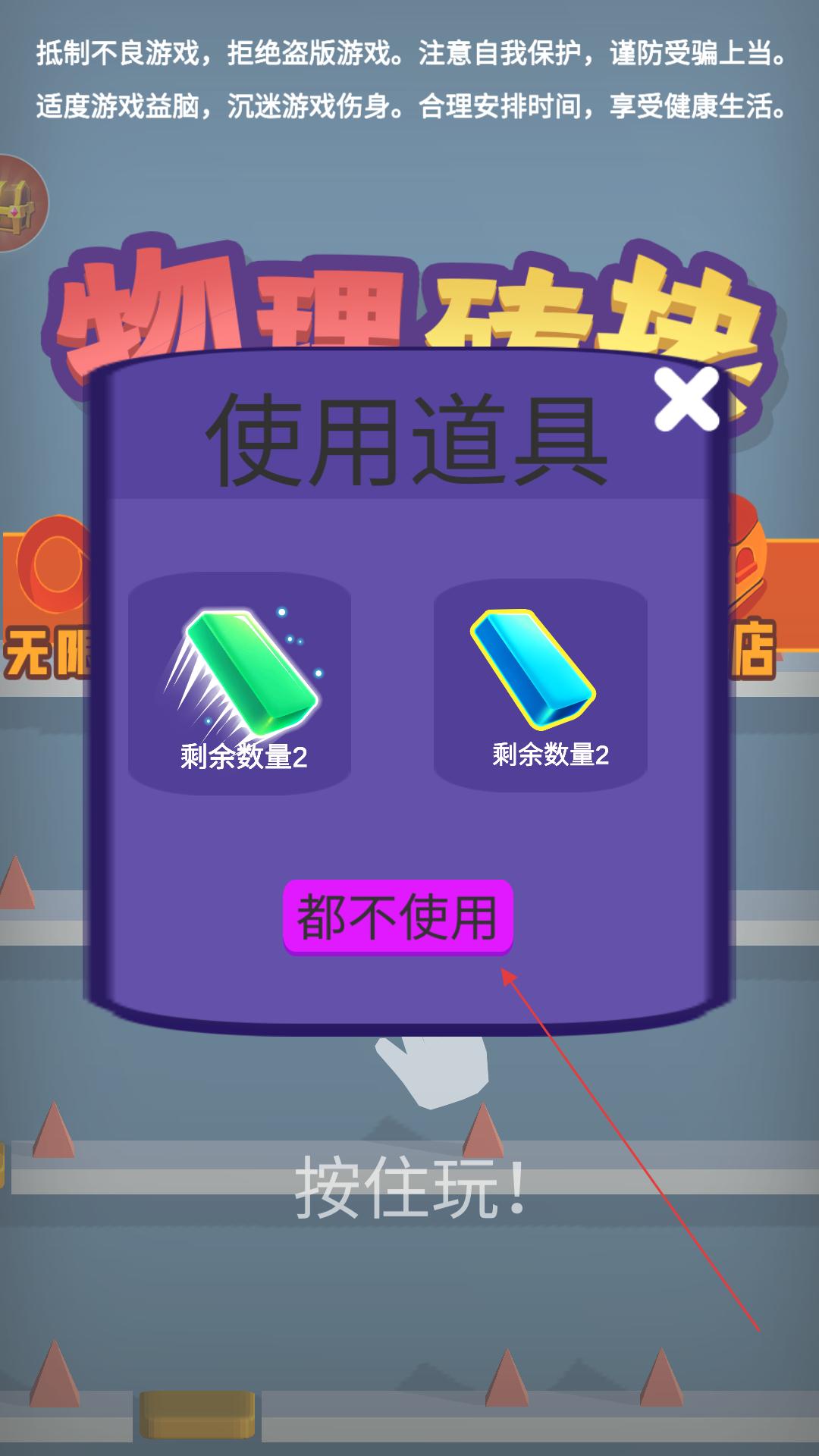 1、進入游戲出現使用道具的提示界面,根據需求選擇是否使用道具,若暫時不使用,點擊都不使用按鈕,進入游戲的主場景。