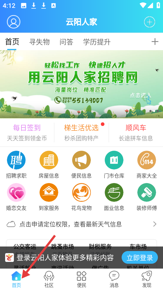 1、首頁集尋失物等功能于一體,主打招聘服務,含每日簽到、便民信息等,覆蓋求職、婚戀等生活服務邀用戶登錄探索。