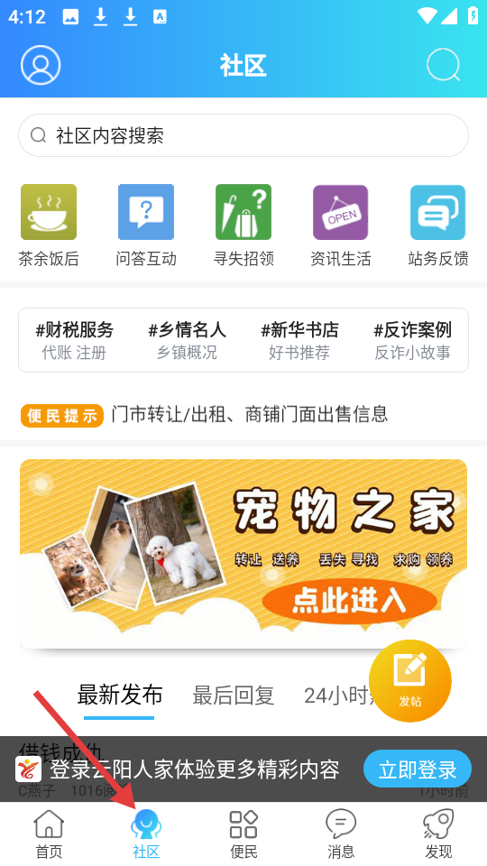 2、社區界面支持內容搜索,劃分茶余飯后等板塊,話題涉及財稅、反詐等,有寵物相關入口,方便用戶交流互動與獲取信息。