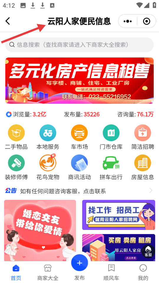 3、便民信息頁面聚焦多元化房產租售,聚合二手交易、本地服務等資訊,瀏覽量等數據醒目,提供搜索與客服咨詢服務。