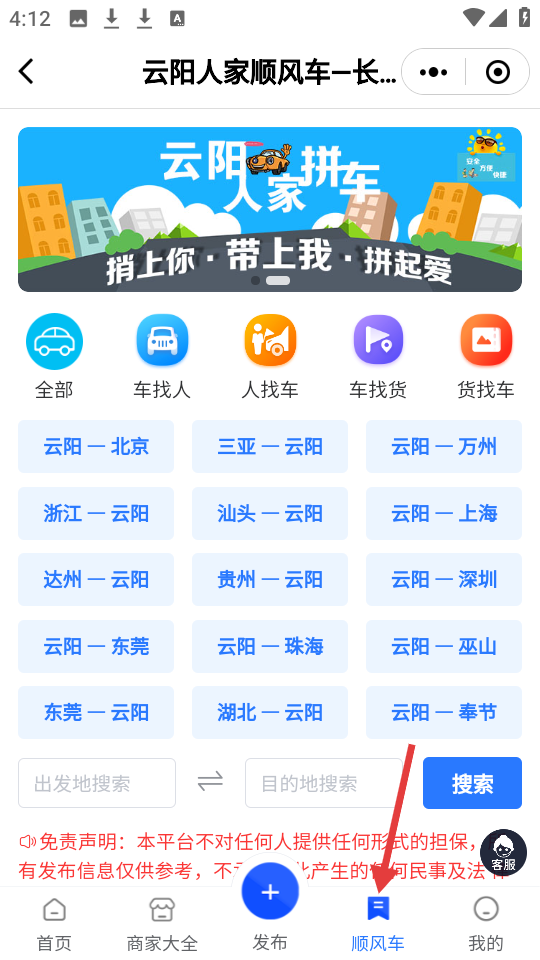 4、順風車頁面展示云陽人家拼車,涵蓋車找人等多種模式,列舉熱門拼車路線,配備搜索欄附免責聲明保障用戶權益。