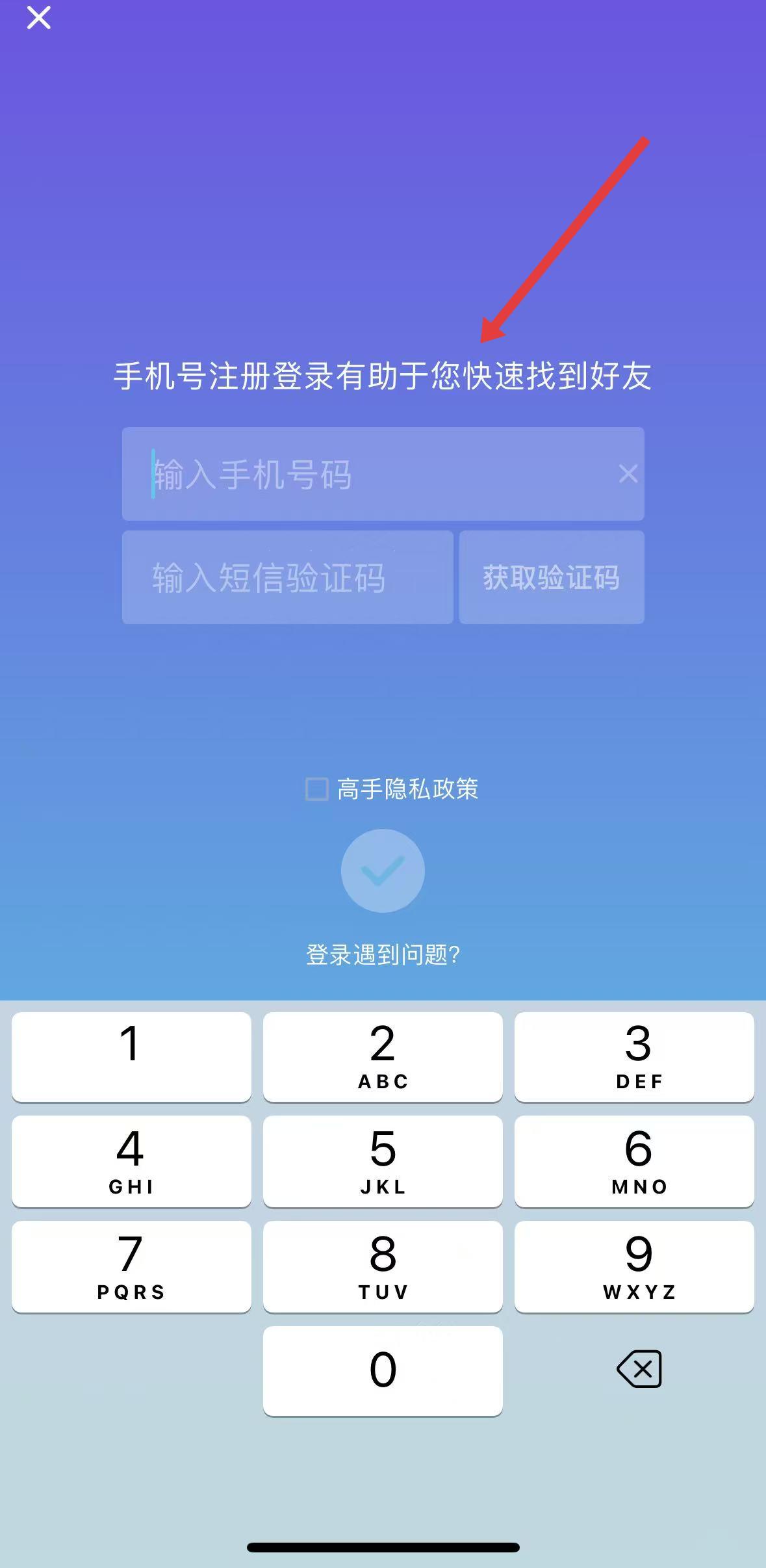 2、手機號注冊登錄頁面提示,該方式有助于快速找到好友,需輸入手機號碼,獲取并輸入短信驗證碼,勾選高手隱私政策后進行登錄。