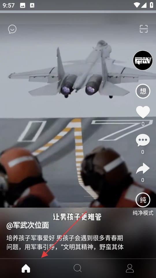 4、頁面展示著與軍事相關的內容,畫面中有戰機等元素,下方有讓男孩子更難管的文字說明,底部導航欄有首頁等功能入口。