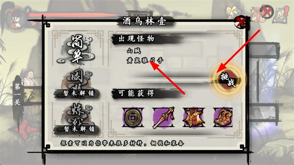 3、挑戰酒烏林壹關卡,擊敗山賊、黃鼠狼等怪物,獲取銅錢、武器等獎勵,提升角色戰力,解鎖新關卡。